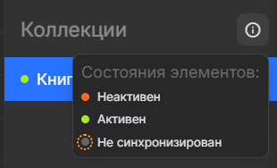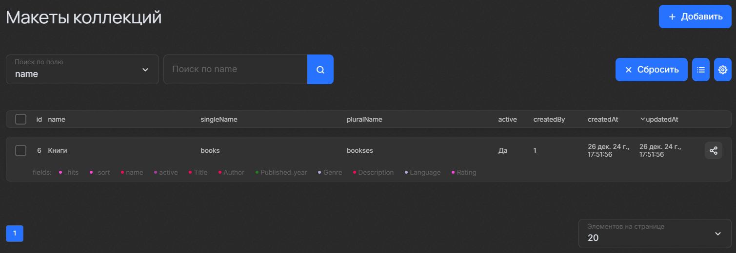 Раздел «Коллекции» предназначен для управления коллекциями данных. Здесь можно просматривать существующие коллекции, добавлять новые, а также редактировать и настраивать их. Коллекции — это основа для организации и работы с данными в системе.