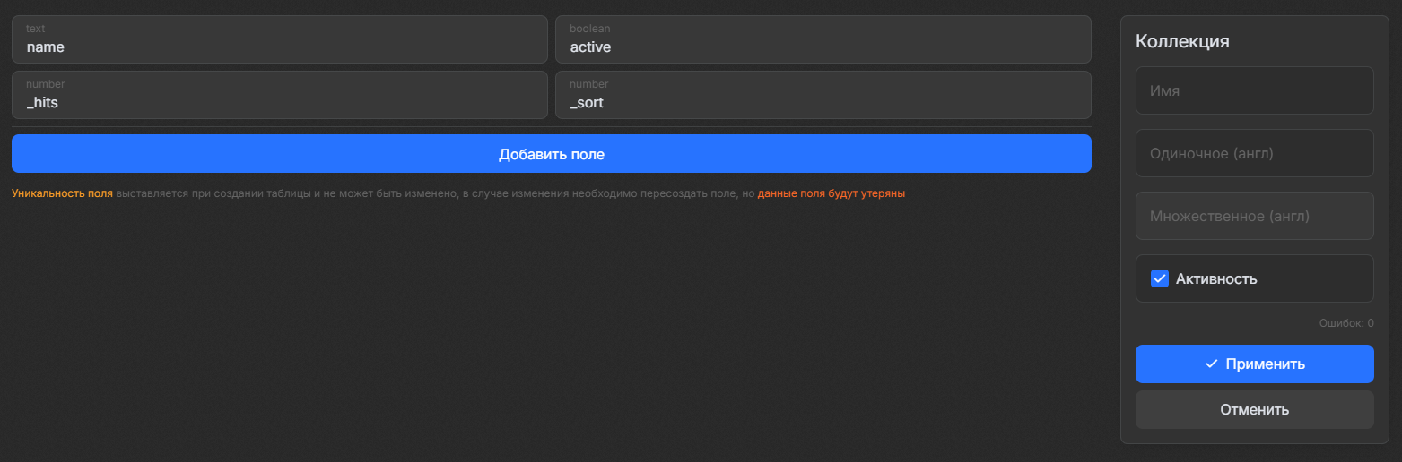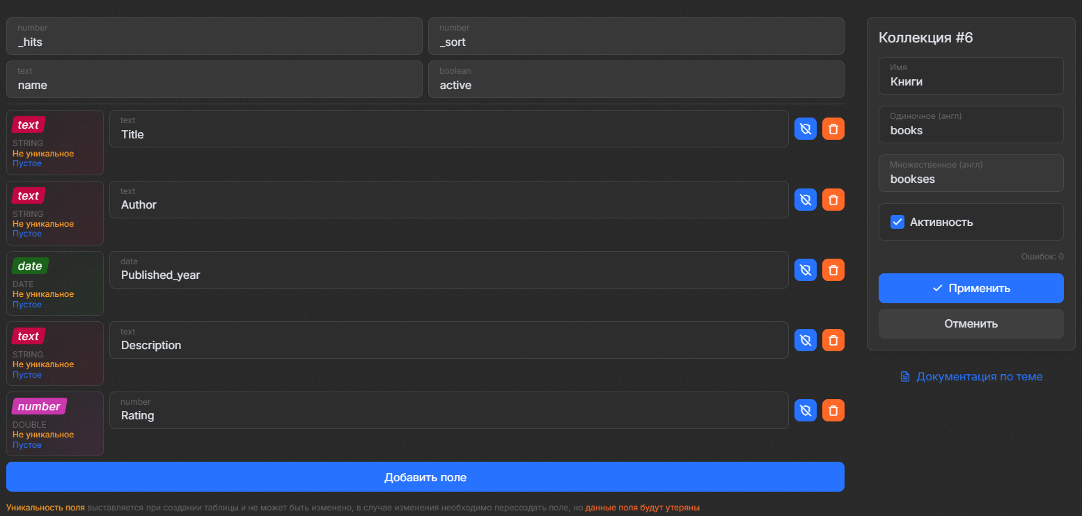 Добавление полей коллекции с настройкой их типа данных, уникальности и обязательности.