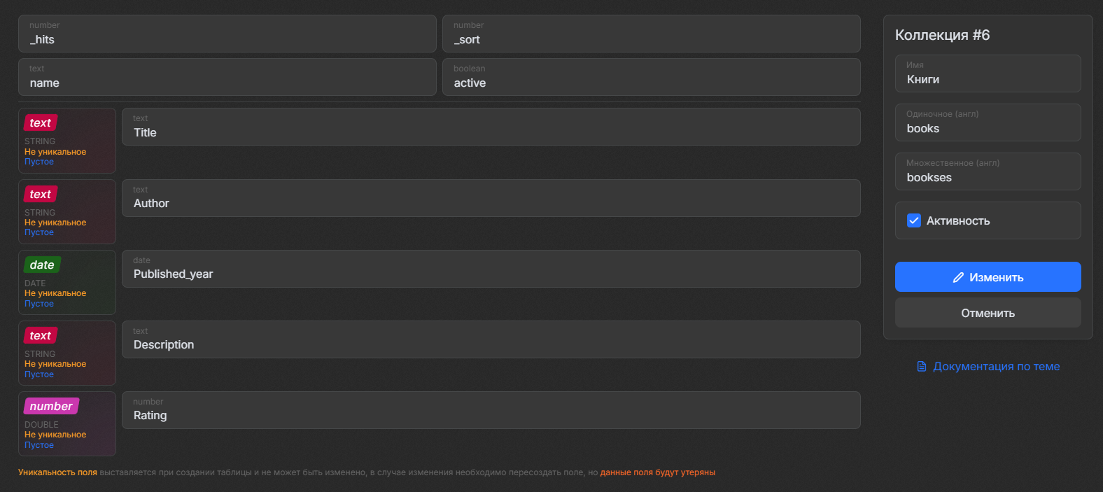 Редактирование существующих полей (тип данных, уникальность, обязательность).