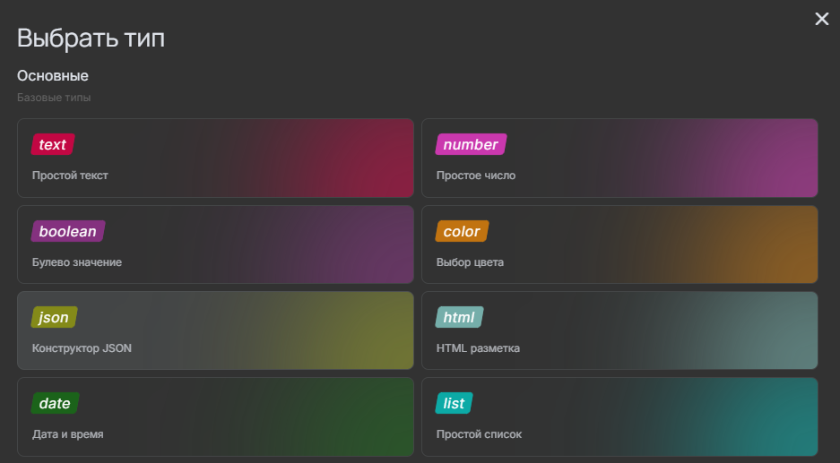 Поля коллекции добавляются через кнопку «Добавить поле». При нажатии на данную кнопку откроется модальное окно для выбора нужного типа поля.