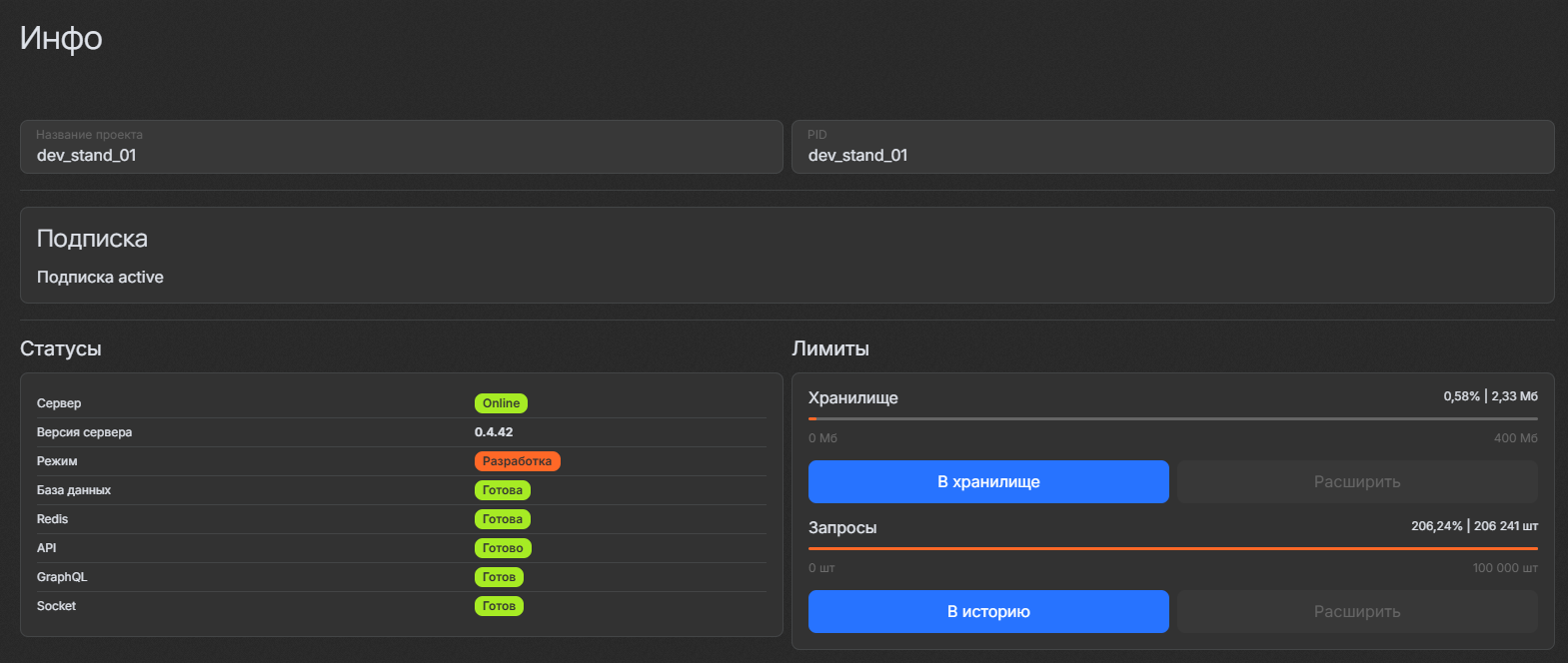 Раздел «Инфо» предоставляет пользователю обзор текущего состояния системы, включая информацию о проекте, подписке, статусах различных компонентов, а также лимитах использования ресурсов. Этот раздел служит отправной точкой для мониторинга производительности платформы и диагностики возможных проблем.