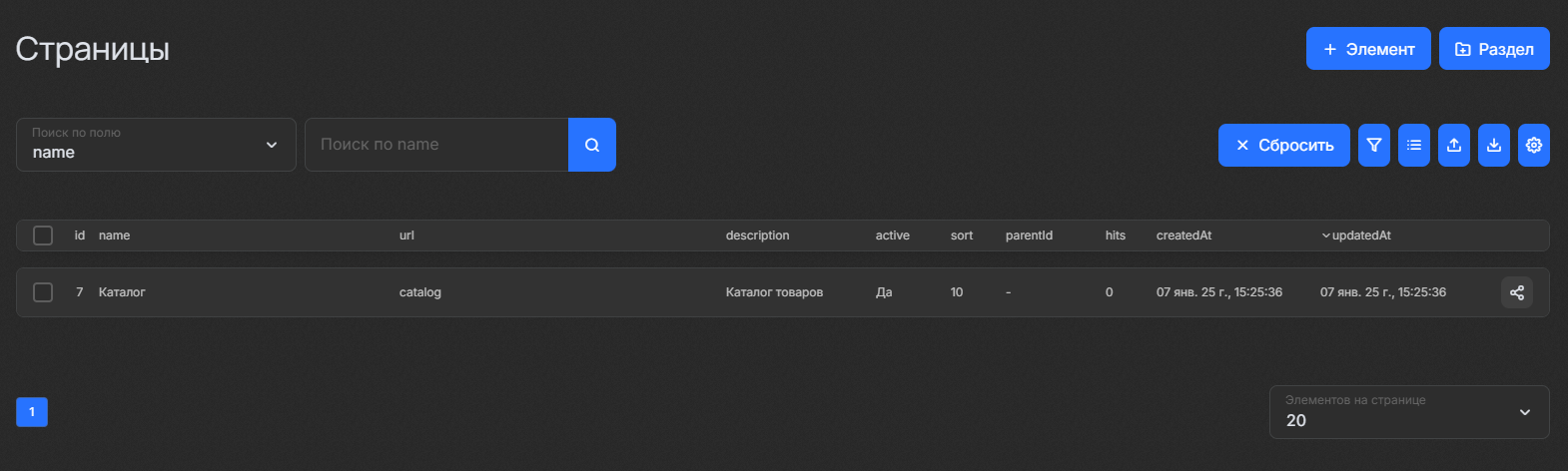 Раздел «Страницы» поддерживает управление элементами и разделами с помощью следующих действий: