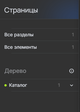 Боковая панель раздела «Страницы» предоставляет аналогичный функционал. Она отображает количество всех разделов и элементов страниц, а также предоставляет дерево навигации для быстрого перехода между разделами и элементами.
