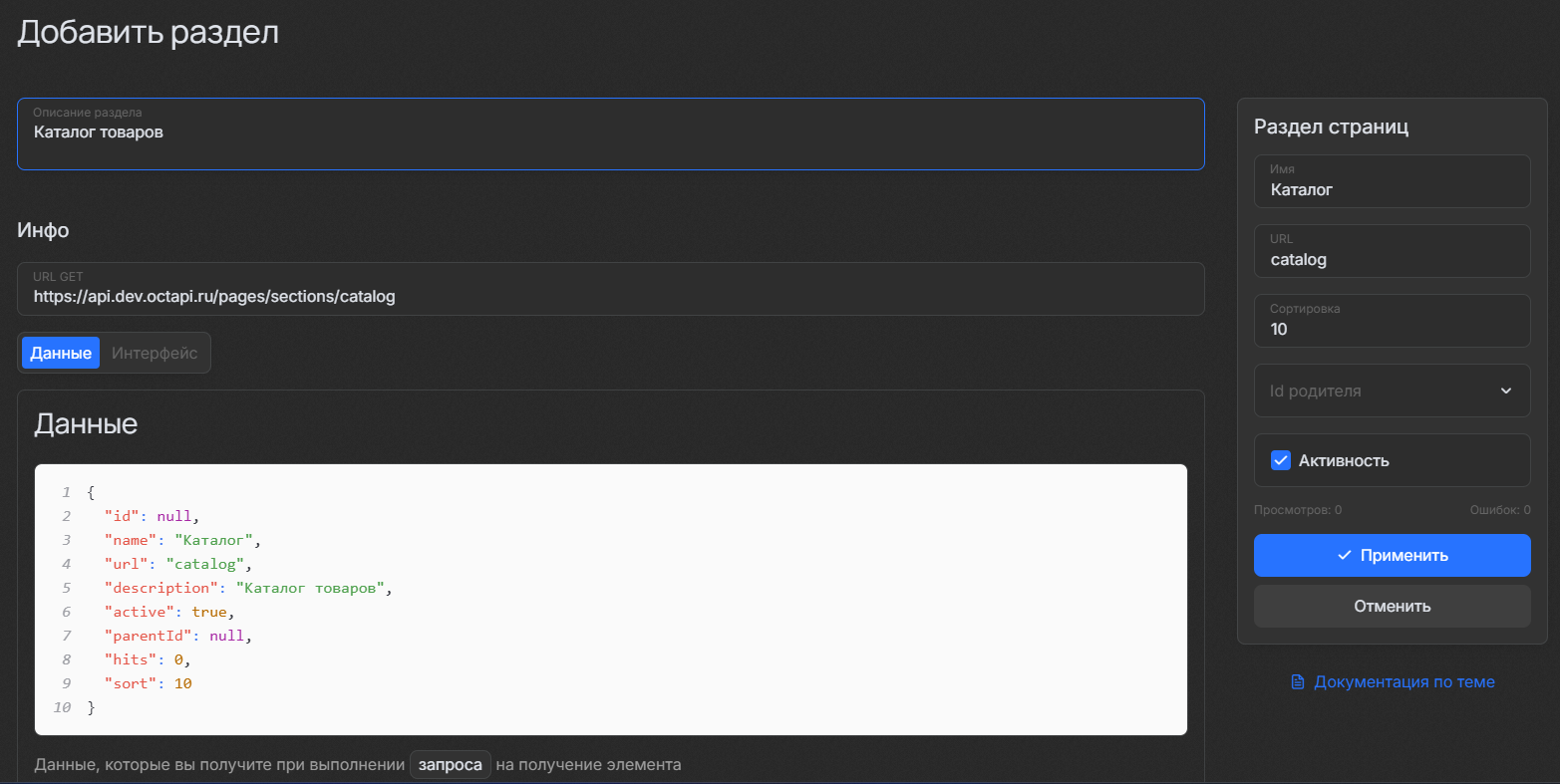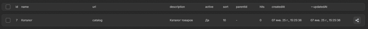 active — статус активности раздела (Да/Нет).