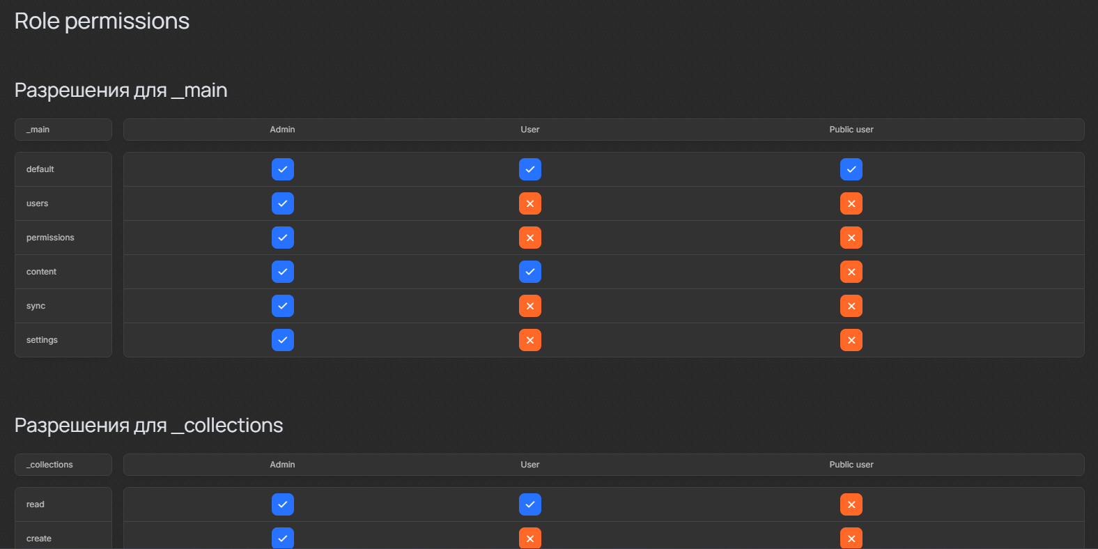 Разрешения отображаются в виде таблицы, где строки — это модули, а колонки — роли. Галочка указывает на наличие доступа, крестик — на его отсутствие.