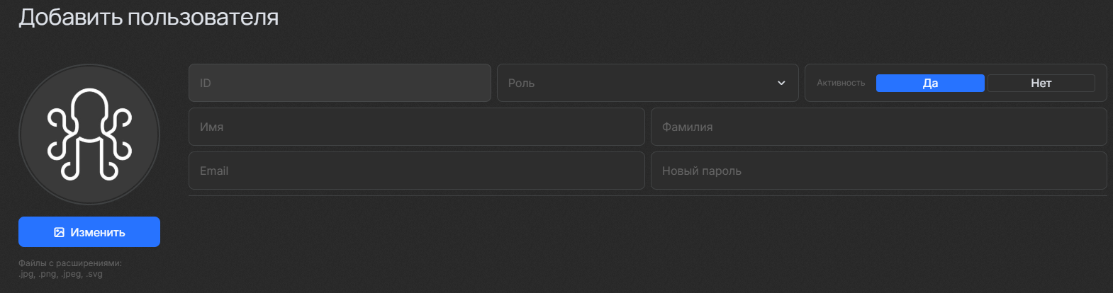 Для добавления нового пользователя нажмите кнопку «Добавить» в правом верхнем углу. Откроется форма, которая выглядит следующим образом: